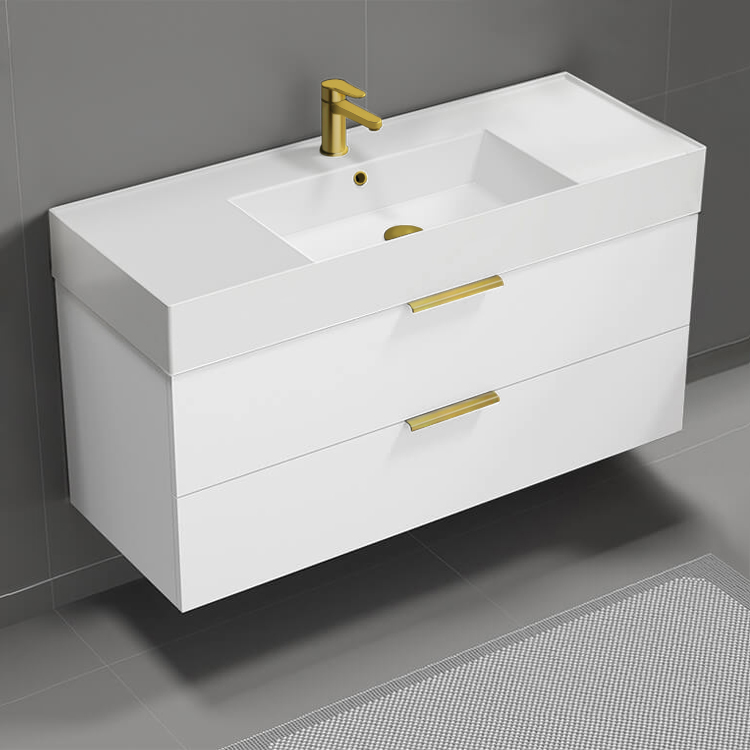 47 Inch Wall Mount Glossy White Bathroom Vanity Cabinet With Matte Gold Handles.