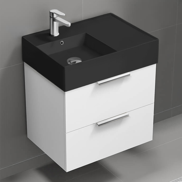 This ultra modern wall mounted bathroom vanity set was designed by high-end brand Nameek's. Inspired by modern and contemporary style bathroom design, this bathroom vanity set comes with a beautiful matte black ceramic sink that perfectly fits into a vanity cabinet with two spacious drawers. Ceramic sink features left aligned basin which allows for more counter space on the right side of the sink. Vanity cabinet is made of durable engineered wood and features two soft-closing drawers with sleek polished chrome drawer handles. This vanity set is part of the Derin collection. Make a bold statement in your bathroom now with this modern bathroom vanity set.