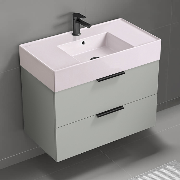 32 Inch Wall Mount Grey Mist Bathroom Vanity Cabinet With Black Handles.