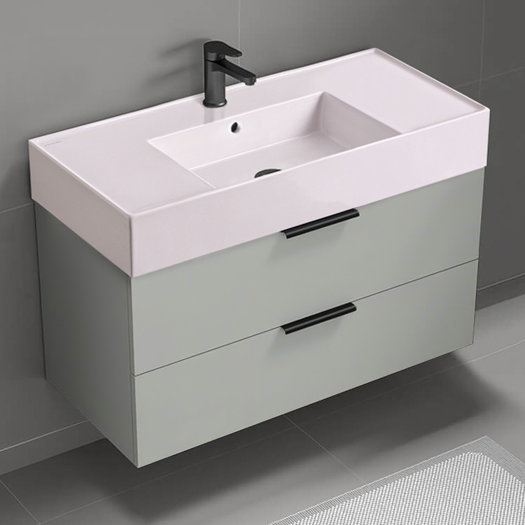 39 Inch Wall Mount Grey Mist Bathroom Vanity Cabinet With Black Handles.