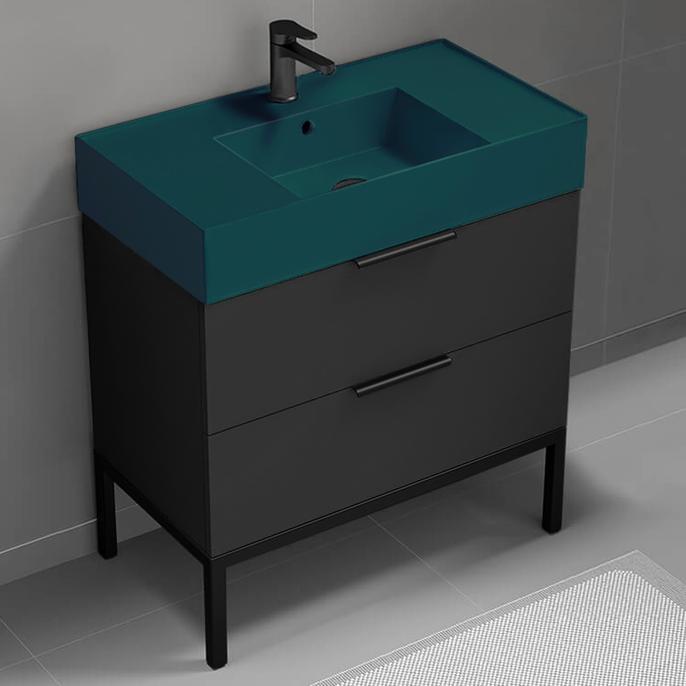 Modern Black Bathroom Vanity, 32", Green Ceramic Sink, Free Standing