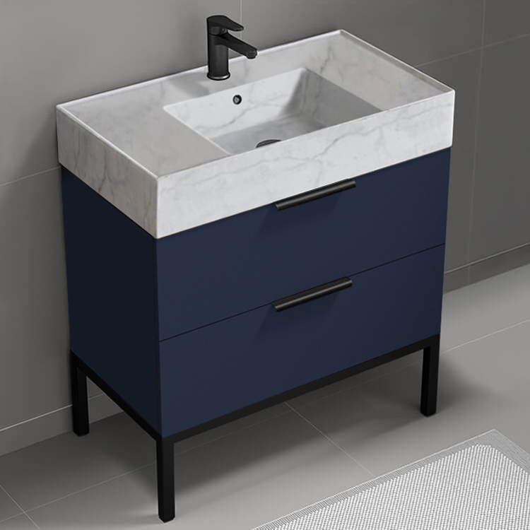 Modern Bathroom Vanity, Blue, 32", Marble Style Sink, Free Standing