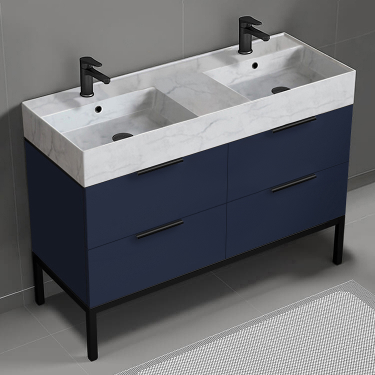 Modern Double Bathroom Vanity, Blue, 48", Marble Style Sink, Free Standing