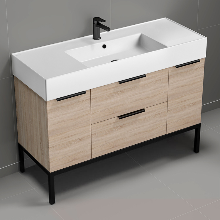 This ultra modern floor standing bathroom vanity set was designed by high-end brand Nameek's. Inspired by modern and contemporary style bathroom design, this bathroom vanity set comes with a beautiful white ceramic sink that perfectly fits into a vanity cabinet with two spacious drawers and two doors. Ceramic sink features counter space on both sides of the basin. Vanity cabinet is made of durable engineered wood and features two soft-closing drawers on the outside and two doors in the middle with sleek black drawer handles. Vanity cabinet attaches on top of a beautiful black base with four vanity feet. This vanity set is part of the Derin collection. Make a bold statement in your bathroom now with this modern bathroom vanity set.