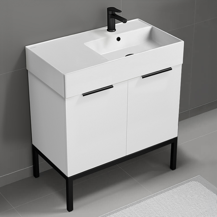 This ultra modern floor standing bathroom vanity set was designed by high-end brand Nameek's. Inspired by modern and contemporary style bathroom design, this bathroom vanity set comes with a beautiful white ceramic sink that perfectly fits into a vanity cabinet with two doors. Ceramic sink features counter space on both sides of the basin. Vanity cabinet is made of durable engineered wood and features two doors with sleek black drawer handles. Vanity cabinet attaches on top of a beautiful black base with four vanity feet. This vanity set is part of the Derin collection. Make a bold statement in your bathroom now with this modern bathroom vanity set.