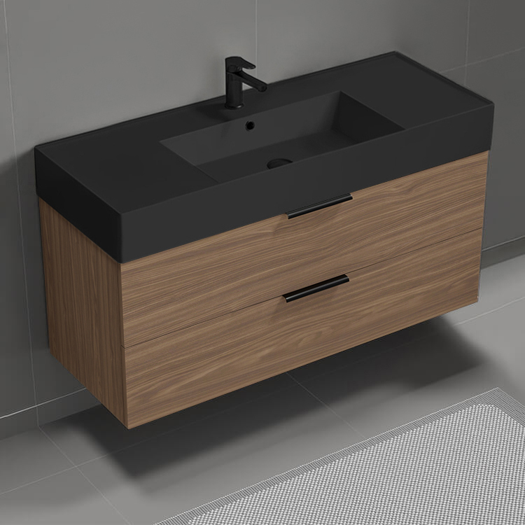 47 Inch Wall Mount Walnut Bathroom Vanity Cabinet With Black Handles.