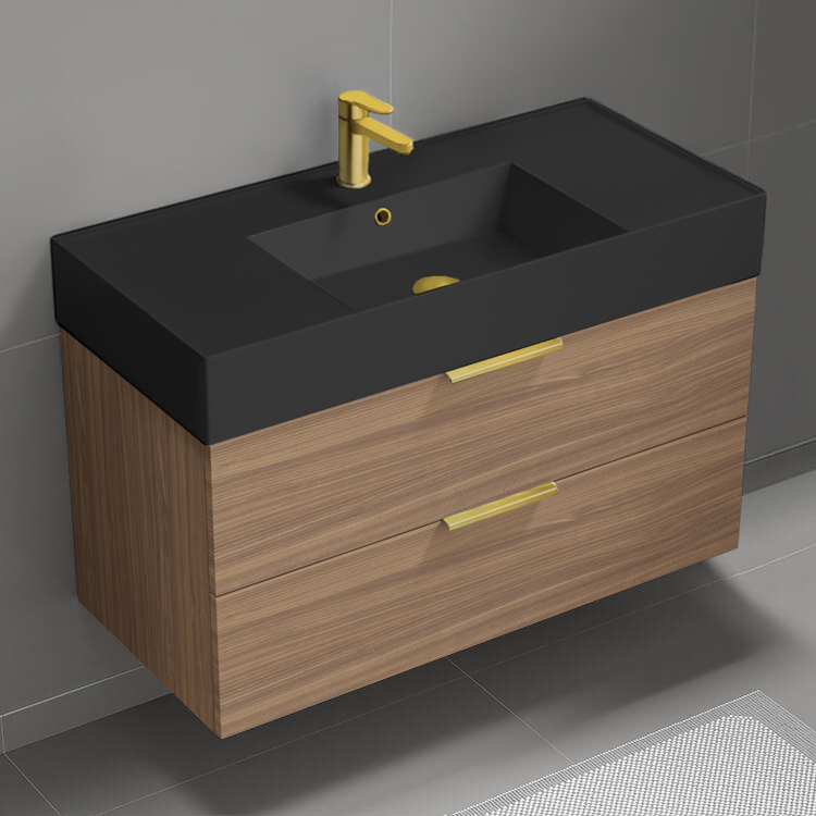 39 Inch Wall Mount Walnut Bathroom Vanity Cabinet With Matte Gold Handles.