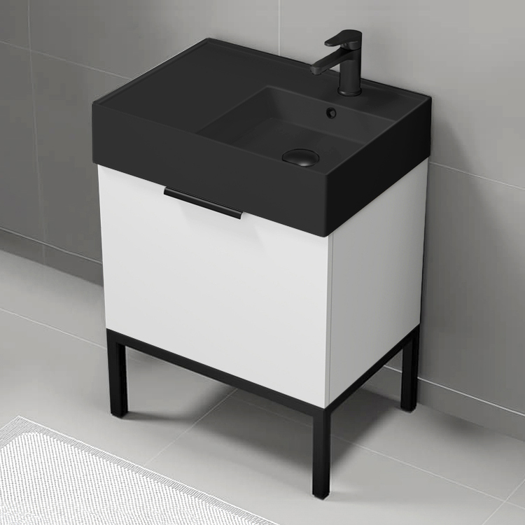 This ultra modern floor standing bathroom vanity set was designed by high-end brand Nameek's. Inspired by modern and contemporary style bathroom design, this bathroom vanity set comes with a beautiful matte black ceramic sink that perfectly fits into a vanity cabinet with one door. Ceramic sink features right aligned basin which allows for more counter space on the left side of the sink. Vanity cabinet is made of durable engineered wood and features one door with sleek black drawer handles. Vanity cabinet attaches on top of a beautiful black base with four vanity feet. This vanity set is part of the Derin collection. Make a bold statement in your bathroom now with this modern bathroom vanity set.