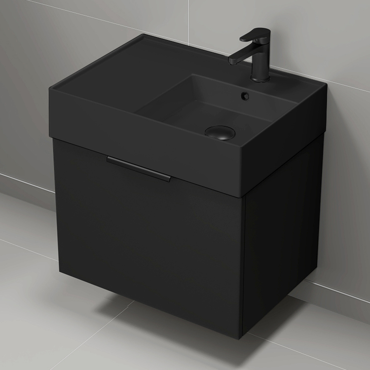 This ultra modern wall mounted bathroom vanity set was designed by high-end brand Nameek's. Inspired by modern and contemporary style bathroom design, this bathroom vanity set comes with a beautiful matte black ceramic sink that perfectly fits into a vanity cabinet with one door. Ceramic sink features right aligned basin which allows for more counter space on the left side of the sink. Vanity cabinet is made of durable engineered wood and features one door with sleek black drawer handles. This vanity set is part of the Derin collection. Make a bold statement in your bathroom now with this modern bathroom vanity set.