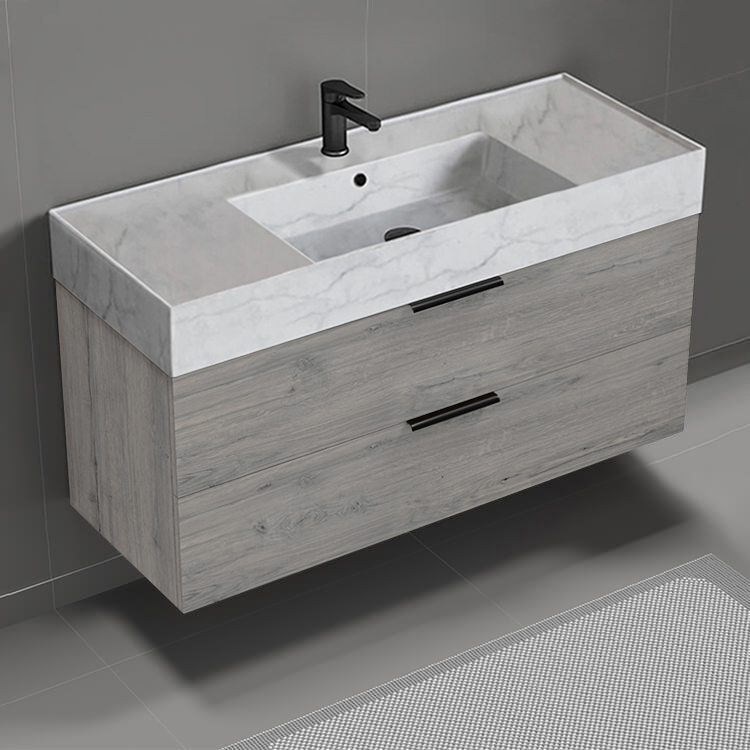 47 Inch Wall Mount Grey Oak Bathroom Vanity Cabinet With Black Handles.
