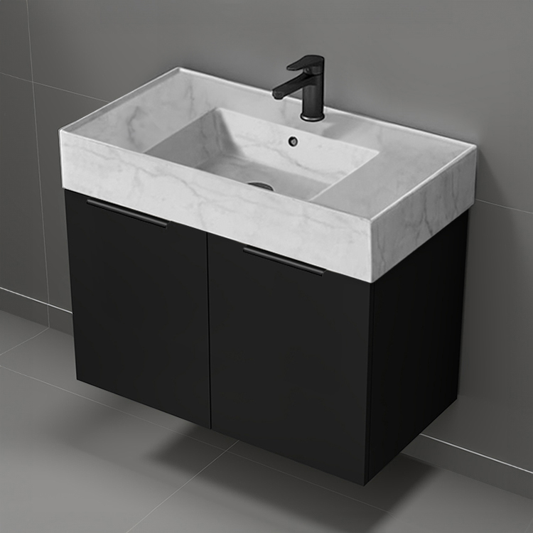 Floating Black Bathroom Vanity, Modern, 32", Marble Style Sink