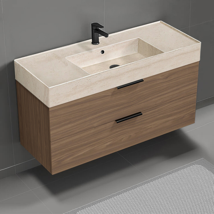 Floating Bathroom Vanity, Modern, Walnut, 48", Travertine Style Sink