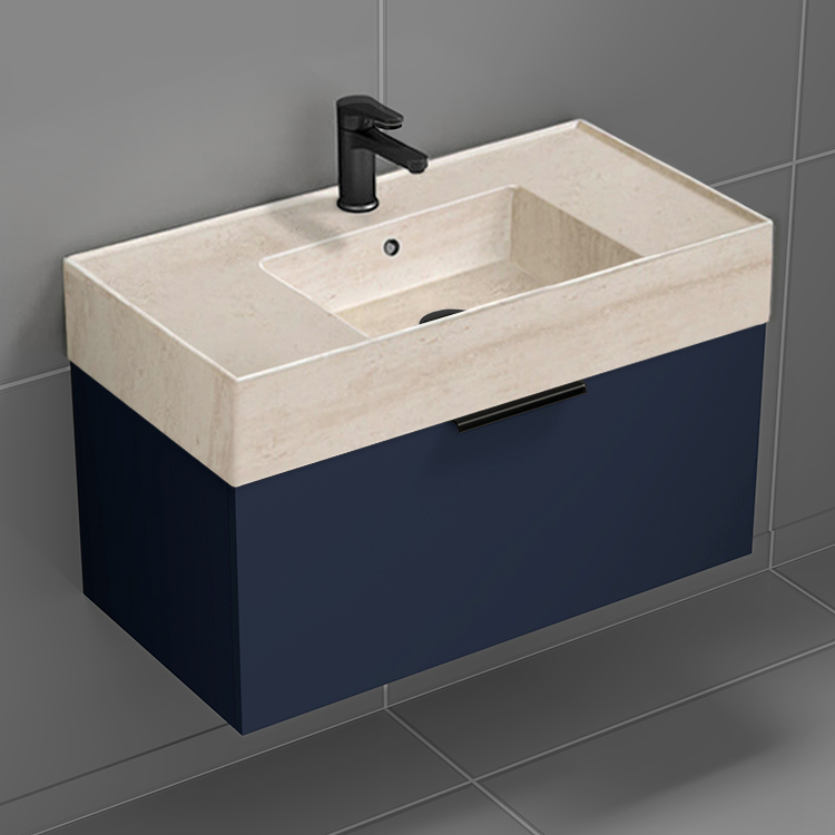 Floating Bathroom Vanity, Modern, Blue, 32", Travertine Style Sink