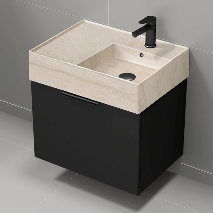 Floating Small Black Bathroom Vanity, Modern, 24", Travertine Style Sink