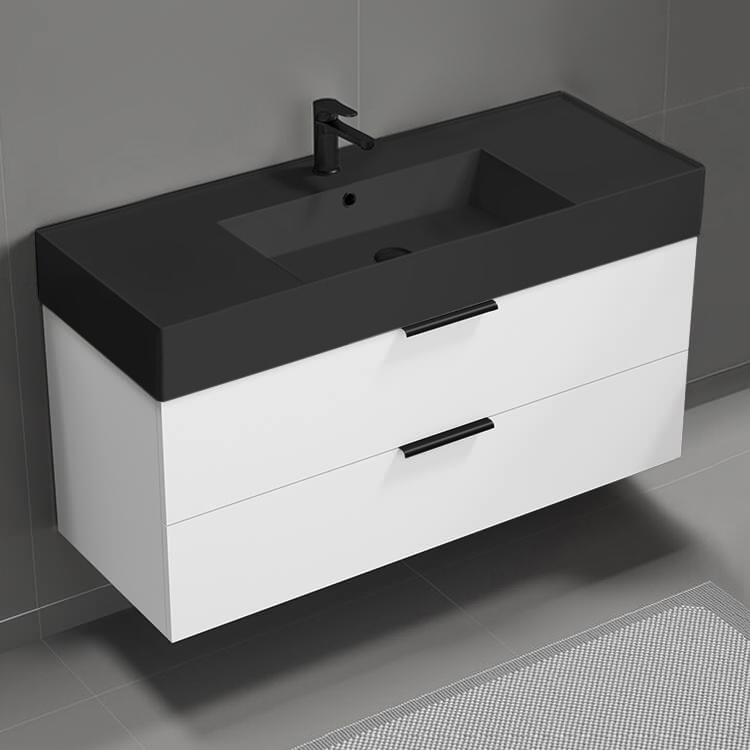 47 Inch Wall Mount Glossy White Bathroom Vanity Cabinet With Black Handles.