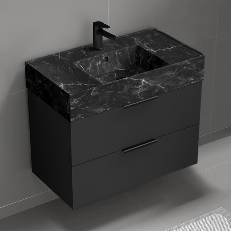 Floating Black Bathroom Vanity, Modern, 32", Black Marble Style Sink