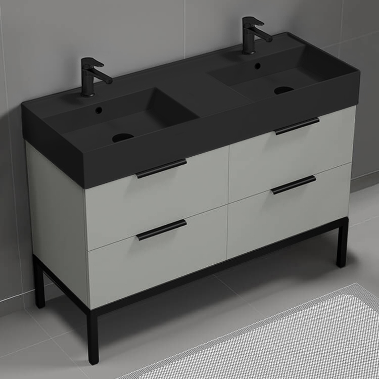 This ultra modern floor standing double bathroom vanity set was designed by high-end brand Nameek's. Inspired by modern and contemporary style bathroom design, this bathroom vanity set comes with a beautiful matte black ceramic double sink that perfectly fits into a vanity cabinet with four spacious drawers. Ceramic sink features counter space in the center of the sink. Vanity cabinet is made of durable engineered wood and features four soft-closing drawers with sleek black drawer handles. Vanity cabinet attaches on top of a beautiful black base with four vanity feet. This vanity set is part of the Derin collection. Make a bold statement in your bathroom now with this modern bathroom vanity set.
