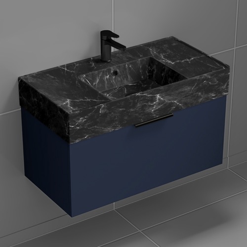 Floating Bathroom Vanity, Modern, Blue, 32", Black Marble Style Sink