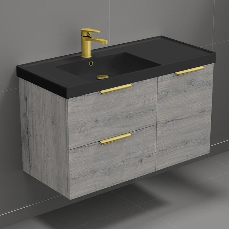 35 Inch Wall Mount Grey Oak Bathroom Vanity Cabinet With Matte Gold Handles.
