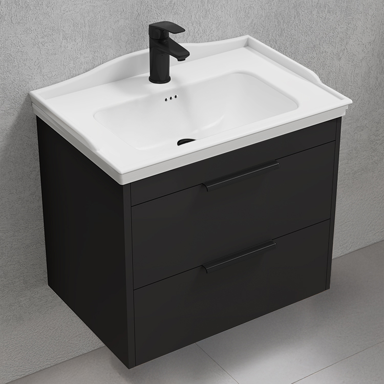 This transitional wall mounted bathroom vanity set was designed by high-end brand Nameek's. Inspired by transitional and traditional style bathroom design, this bathroom vanity set comes with a beautiful white ceramic sink that perfectly fits into a vanity cabinet with two spacious drawers. Vanity cabinet is made of durable engineered wood and features two soft-closing drawers with sleek black drawer handles. This vanity set is part of the Marbella collection. Make a bold statement in your bathroom now with this transitional bathroom vanity set.