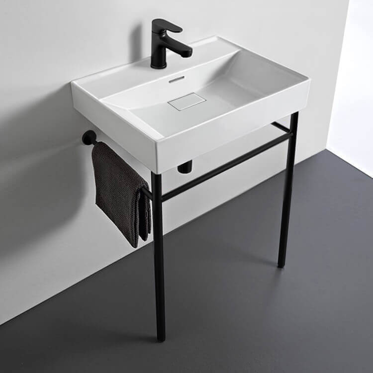 This bathroom console sink is ideal for smaller bathrooms, powder rooms, and guest bathrooms where space is more limited. This uniquely stylish white ceramic console sink comes with a beautiful stand made of high-quality brass in a matte black finish to give a distinctive feel to any bathroom. Available in one or three hole options, this two piece sink is the perfect addition for your modern bathroom. Ceramic sink (Cerastyle 037100-U) is US and Canada standards approved (IAPMO, UPC/cUPC, ASME A112.19.2-2018/CSA B45.1-18).