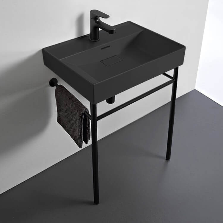 This bathroom console sink is ideal for smaller bathrooms, powder rooms, and guest bathrooms where space is more limited. This uniquely stylish matte black ceramic console sink comes with a beautiful stand made of high-quality brass in a matte black finish to give a distinctive feel to any bathroom. Available in one or three hole options, this two piece sink is the perfect addition for your modern bathroom. Ceramic sink (Cerastyle 037107-U-97) is US and Canada standards approved (IAPMO, UPC/cUPC, ASME A112.19.2-2018/CSA B45.1-18).