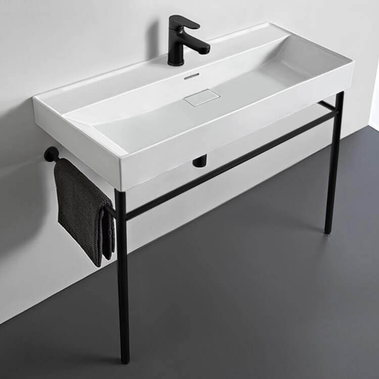 This uniquely stylish white ceramic console sink comes with a beautiful stand made of high-quality brass in a matte black finish to give a distinctive feel to any bathroom. Available in one or three hole options, this two piece sink is the perfect addition for your modern bathroom. Ceramic sink (Cerastyle 037500-U) is US and Canada standards approved (IAPMO, UPC/cUPC, ASME A112.19.2-2018/CSA B45.1-18).