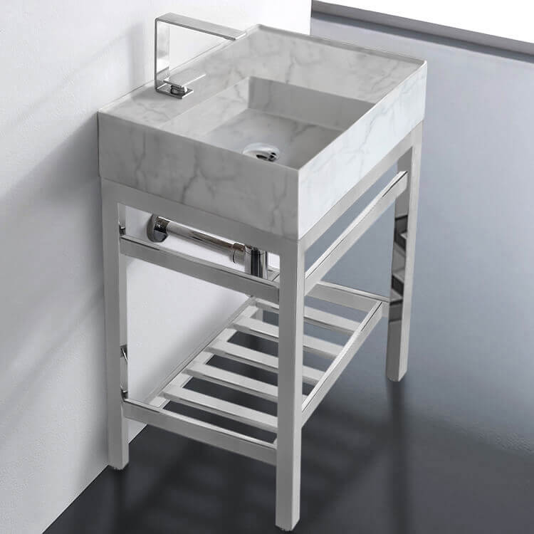 This bathroom console sink is ideal for smaller bathrooms, powder rooms, and guest bathrooms where space is more limited. This console bathroom sink is a perfect center piece for the modern style bathroom. Featuring a lower towel rack, this console stand is a perfect solution to keep your towels and other accessories tidy. Console stand is made of heavy duty stainless steel in a polished chrome finish. Beautiful 23.6" x 17.3" ceramic sink with right counter space. Ceramic sink (Scarabeo 5114) is US and Canada standards approved (IAPMO, UPC/cUPC, ASME A112.19.2-2018/CSA B45.1-18).