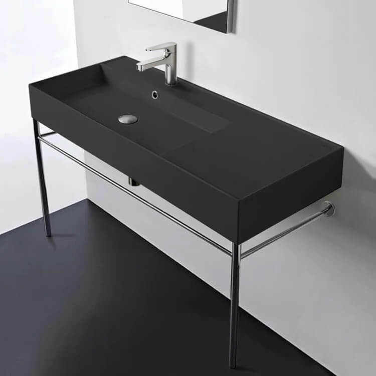 This bathroom sink console is a perfect center piece for the modern style bathroom. It is a 40 inch console that comes with matte black ceramic sink and polished chrome console bars to mount your sink at the perfect heigh in a stylish design. This console sink was designed and manufactured in Italy by Scarabeo. Ceramic sink (Scarabeo 5119) is US and Canada standards approved (IAPMO, UPC/cUPC, ASME A112.19.2-2018/CSA B45.1-18).