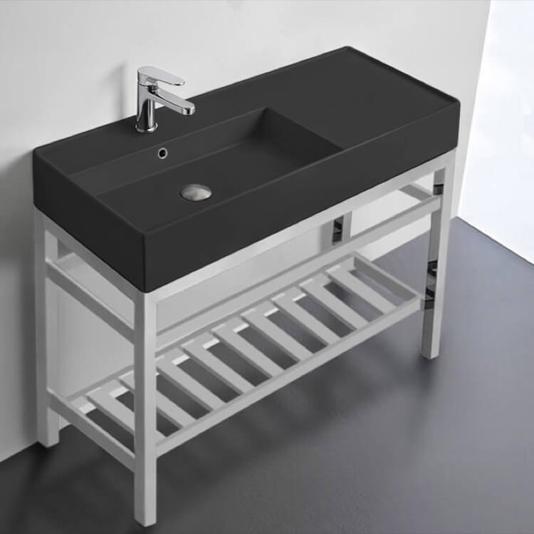 This console bathroom sink is a perfect center piece for the modern style bathroom. Featuring a lower towel rack, this console stand is a perfect solution to keep your towels and other accessories tidy. Console stand is made of heavy duty stainless steel in a polished chrome finish. Beautiful 39.8" x 18.1" matte black ceramic sink with counter space on the right side of the basin. Ceramic sink (Scarabeo 5119) is US and Canada standards approved (IAPMO, UPC/cUPC, ASME A112.19.2-2018/CSA B45.1-18).