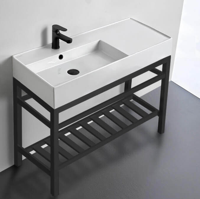 This console bathroom sink is a perfect center piece for the modern style bathroom. Featuring a lower towel rack, this console stand is a perfect solution to keep your towels and other accessories tidy. Console stand is made of heavy duty stainless steel in a matte black finish. Beautiful 39.8" x 18.1" white ceramic sink with counter space on right side of the basin. Ceramic sink (Scarabeo 5119) is US and Canada standards approved (IAPMO, UPC/cUPC, ASME A112.19.2-2018/CSA B45.1-18).