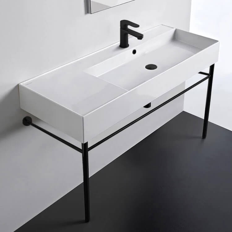 This bathroom sink console is a perfect center piece for the modern style bathroom. It is a 40 inch console that comes with ceramic sink and matte black console bars to mount your sink at the perfect heigh in a stylish design. This console sink was designed and manufactured in Italy by Scarabeo. Ceramic sink (Scarabeo 5120) is US and Canada standards approved (IAPMO, UPC/cUPC, ASME A112.19.2-2018/CSA B45.1-18).