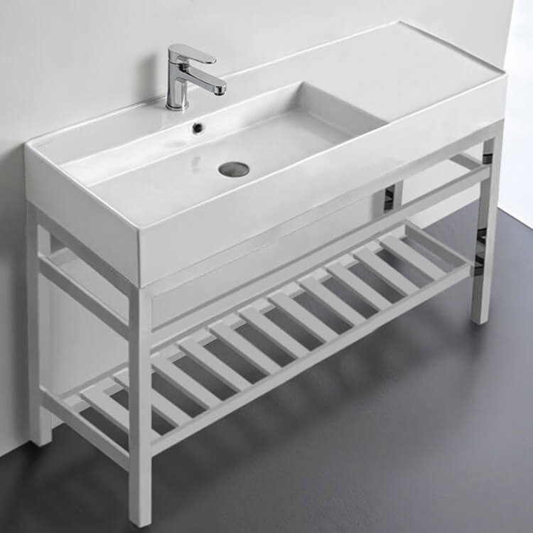 This 48 inch console set was designed by Italian manufacturer Scarabeo. Inspired by the modern or contemporary style bathroom, this console comes with a white ceramic sink and chrome console mount. Featuring a lower towel rack, this console stand is a perfect solution to keep your towels and other accessories tidy. Console stand is made of heavy duty stainless steel in a polished chrome finish. This console is available in no hole, one hole or three hole settings. It is part of the Teorema 2.0 collection. Ceramic sink (Scarabeo 5121) is US and Canada standards approved (IAPMO, UPC/cUPC, ASME A112.19.2-2018/CSA B45.1-18).