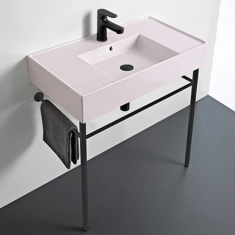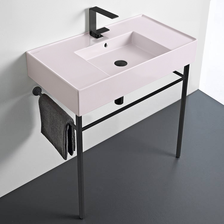 Perfect for the modern or contemporary bathroom atmosphere, this 32 inch bathroom console is made from built-to-last light pink ceramic. It comes in the one hole or three hole options. It comes complete with a matte black legs made from brass. It was made in Italy by Scarabeo as part of their Teorema 2.0 collection. Ceramic sink (Scarabeo 5123-49) is US and Canada standards approved (IAPMO, UPC/cUPC, ASME A112.19.2-2018/CSA B45.1-18).