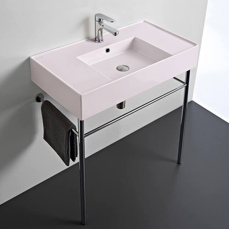 Perfect for the modern or contemporary bathroom atmosphere, this 32 inch bathroom console is made from built-to-last light pink ceramic. It comes in the one hole or three hole options. It comes complete with a polished chrome legs made from brass. It was made in Italy by Scarabeo as part of their Teorema 2.0 collection. Ceramic sink (Scarabeo 5123-49) is US and Canada standards approved (IAPMO, UPC/cUPC, ASME A112.19.2-2018/CSA B45.1-18).