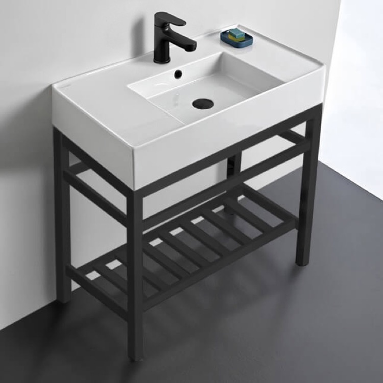 This console bathroom sink is a perfect center piece for the modern style bathroom. Featuring a lower towel rack, this console stand is a perfect solution to keep your towels and other accessories tidy. Console stand is made of heavy duty stainless steel in a matte black finish. Beautiful 31.9" x 17.4" white ceramic sink with counter space on both side of the basin. Ceramic sink (Scarabeo 5123) is US and Canada standards approved (IAPMO, UPC/cUPC, ASME A112.19.2-2018/CSA B45.1-18).