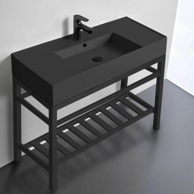 This matte black console bathroom sink is a perfect center piece for the modern style bathroom. Featuring a lower towel rack, this console stand is a perfect solution to keep your towels and other accessories tidy. Console stand is made of heavy duty stainless steel in a matte black finish. Beautiful 40" x 18.2" matte black ceramic sink with counter space on both side of the basin. Ceramic sink (Scarabeo 5124-49) is US and Canada standards approved (IAPMO, UPC/cUPC, ASME A112.19.2-2018/CSA B45.1-18).