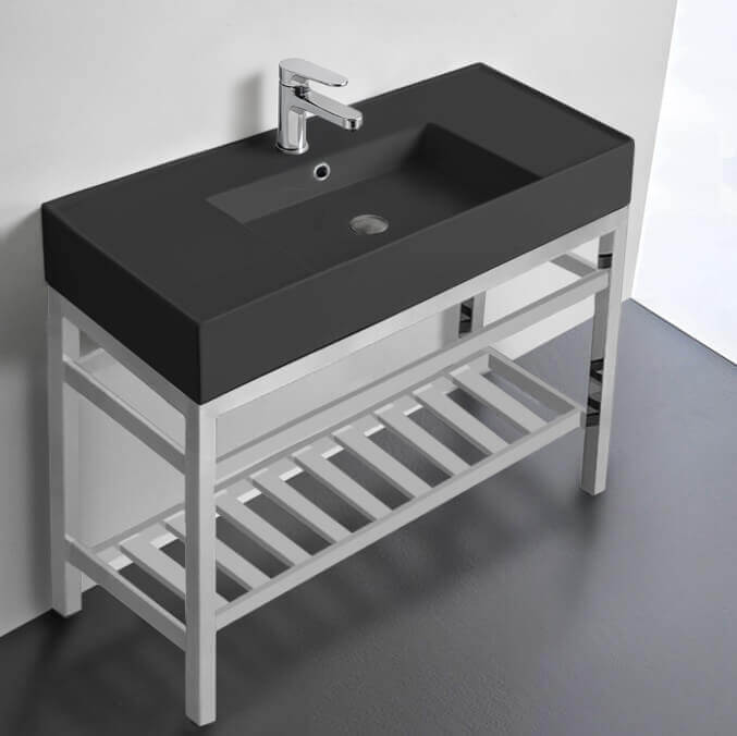 This matte black console bathroom sink is a perfect center piece for the modern style bathroom. Featuring a lower towel rack, this console stand is a perfect solution to keep your towels and other accessories tidy. Console stand is made of heavy duty stainless steel in a polished chrome finish. Beautiful 40" x 18.2" matte black ceramic sink with counter space on both side of the basin. Ceramic sink (Scarabeo 5124-49) is US and Canada standards approved (IAPMO, UPC/cUPC, ASME A112.19.2-2018/CSA B45.1-18).