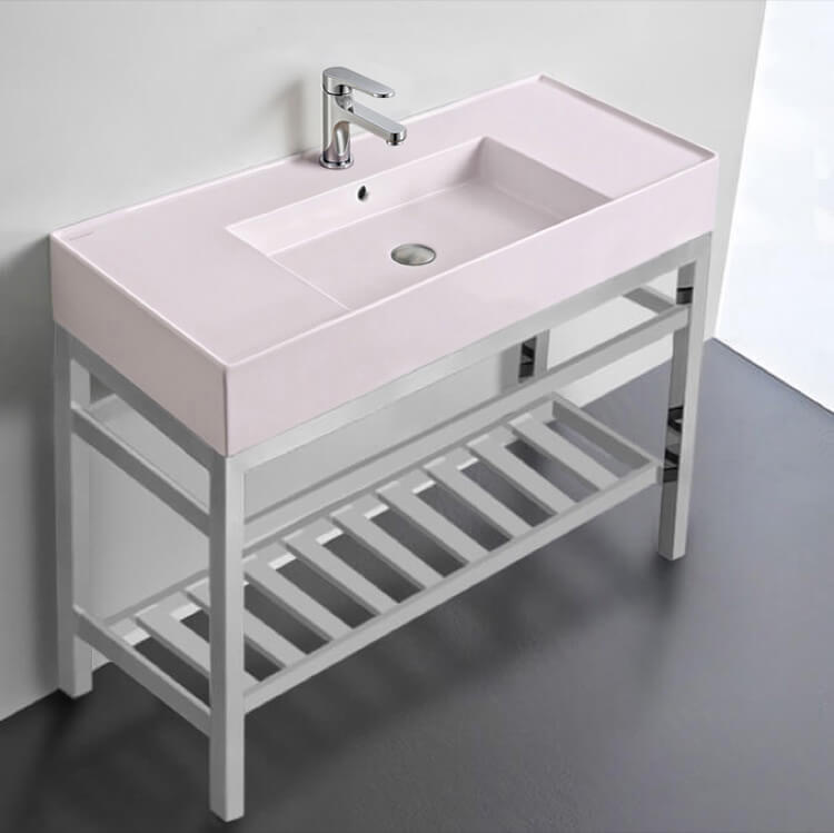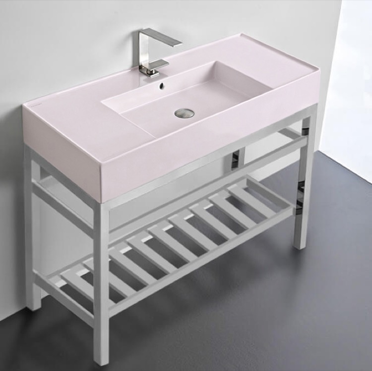 This matte black console bathroom sink is a perfect center piece for the modern style bathroom. Featuring a lower towel rack, this console stand is a perfect solution to keep your towels and other accessories tidy. Console stand is made of heavy duty stainless steel in a polished chrome finish. Beautiful 40" x 18.2" light pink ceramic sink with counter space on both side of the basin. Ceramic sink (Scarabeo 5124-49) is US and Canada standards approved (IAPMO, UPC/cUPC, ASME A112.19.2-2018/CSA B45.1-18).