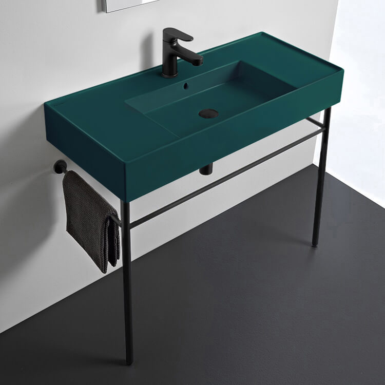 Perfect for the modern or contemporary bathroom atmosphere, this 40 inch bathroom console is made from built-to-last jade green ceramic. It comes in the one hole or three hole. It comes complete with a matte black legs made from brass. It was made in Italy by Scarabeo as part of their Teorema 2.0 collection. Ceramic sink (Scarabeo 5124-49) is US and Canada standards approved (IAPMO, UPC/cUPC, ASME A112.19.2-2018/CSA B45.1-18).