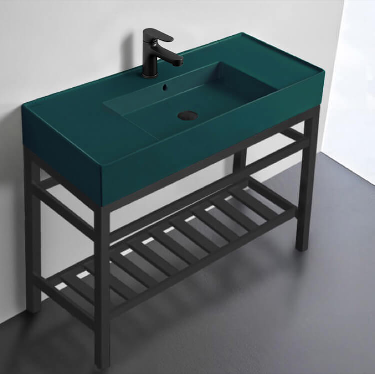 This matte black console bathroom sink is a perfect center piece for the modern style bathroom. Featuring a lower towel rack, this console stand is a perfect solution to keep your towels and other accessories tidy. Console stand is made of heavy duty stainless steel in a matte black finish. Beautiful 40" x 18.2" jade green ceramic sink with counter space on both side of the basin. Ceramic sink (Scarabeo 5124-49) is US and Canada standards approved (IAPMO, UPC/cUPC, ASME A112.19.2-2018/CSA B45.1-18).