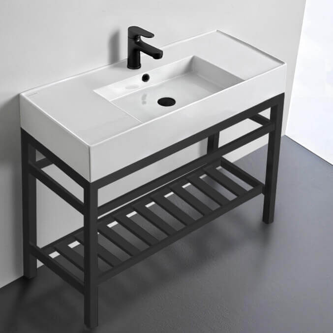This console bathroom sink is a perfect center piece for the modern style bathroom. Featuring a lower towel rack, this console stand is a perfect solution to keep your towels and other accessories tidy. Console stand is made of heavy duty stainless steel in a matte black finish. Beautiful 40" x 18.2" white ceramic sink with counter space on both side of the basin. Ceramic sink (Scarabeo 5124) is US and Canada standards approved (IAPMO, UPC/cUPC, ASME A112.19.2-2018/CSA B45.1-18).
