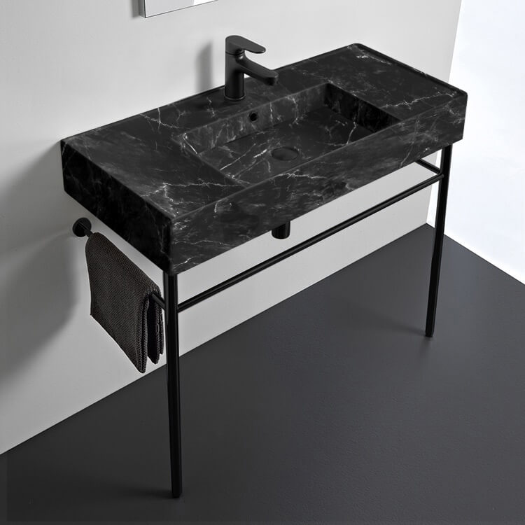Perfect for the modern or contemporary bathroom atmosphere, this 40 inch bathroom console is made from built-to-last black marble design ceramic. It comes in the one hole or three hole options. It comes complete with a matte black legs made from brass. It was made in Italy by Scarabeo as part of their Teorema 2.0 collection. Ceramic sink (Scarabeo 5124-49) is US and Canada standards approved (IAPMO, UPC/cUPC, ASME A112.19.2-2018/CSA B45.1-18).