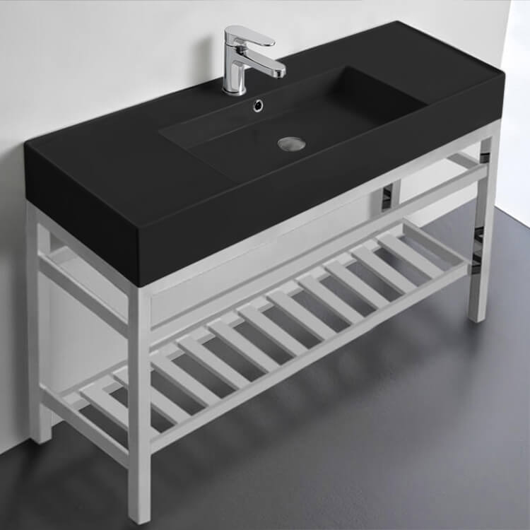 This 48 inch console set was designed by Italian manufacturer Scarabeo. Inspired by the modern or contemporary style bathroom, this console comes with a matte black ceramic sink and chrome console mount. Featuring a lower towel rack, this console stand is a perfect solution to keep your towels and other accessories tidy. Console stand is made of heavy duty stainless steel in a polished chrome finish. This console is available in one hole, three hole, or no hole settings. It is part of the Teorema 2.0 collection. Ceramic sink (Scarabeo 5125) is US and Canada standards approved (IAPMO, UPC/cUPC, ASME A112.19.2-2018/CSA B45.1-18).