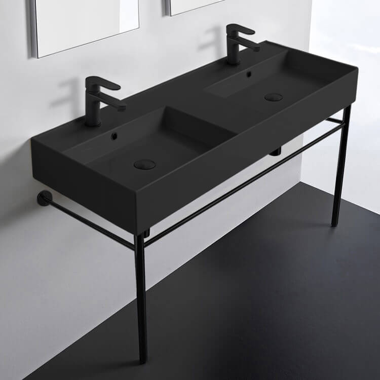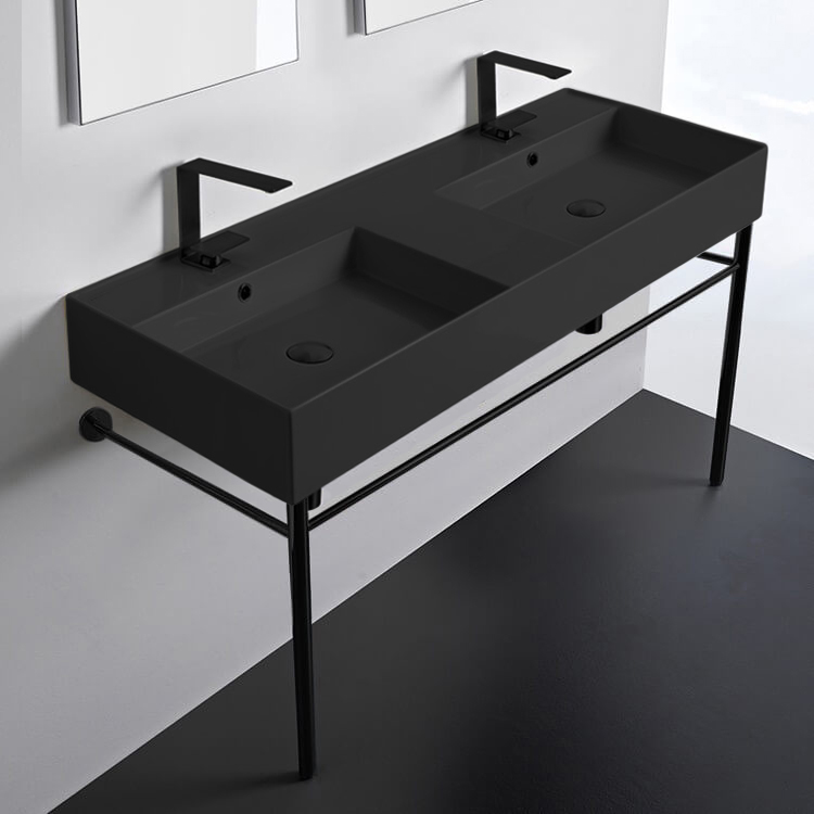 This 48 inch double console set is a perfect vanity choice for your bathroom. Inspired by the modern style bathroom design, this console comes with a double ceramic sink and matte black console stand. Console stand is made of heavy duty brass in a matte black. This double matte black ceramic sink features a modern design with counter space in the middle of basin. This console is made and designed in Italy by luxury brand Scarabeo and part of the Teorema 2.0 collection. Ceramic sink (Scarabeo 5143-49) is US and Canada standards approved (IAPMO, UPC/cUPC, ASME A112.19.2-2018/CSA B45.1-18).