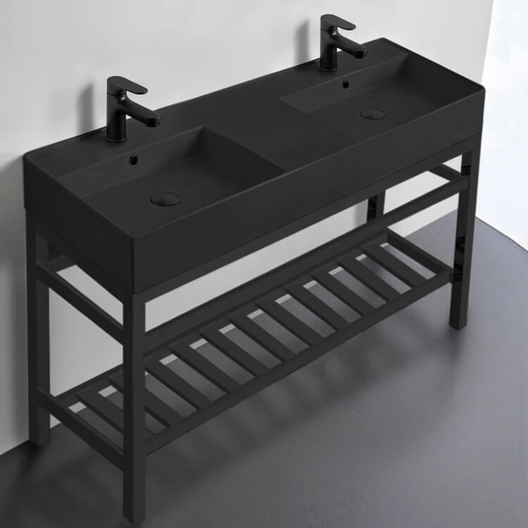 This 48 inch double console set is a perfect vanity choice for your bathroom. Inspired by the modern style bathroom design, this console comes with a double ceramic sink and matte black console stand. Featuring a lower towel rack, this console stand is a perfect solution to keep your towels and other accessories tidy. Console stand is made of heavy duty stainless steel in a matte black finish. This double matte black ceramic sink features a modern design with counter space in the middle of basin. This console is made and designed in Italy by luxury brand Scarabeo and part of the Teorema 2.0 collection. Ceramic sink (Scarabeo 5143-49) is US and Canada standards approved (IAPMO, UPC/cUPC, ASME A112.19.2-2018/CSA B45.1-18).