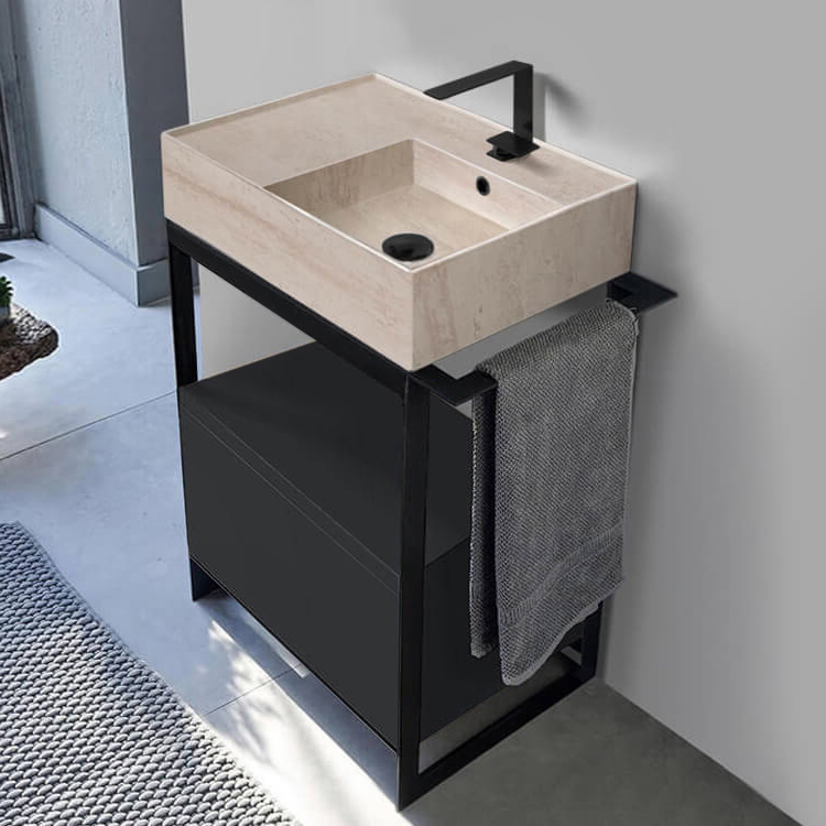 This ultra modern console vanity set was designed by Italian manufacturer Scarabeo. Inspired by modern and contemporary style bathroom design, this console set comes with a beautiful beige travertine design ceramic sink that perfectly fits into a matte black sleek console base with a large drawer in a matte black finish. Ceramic sink features right aligned basin which allows for more counter space on the left side of the sink. Sink is available in a one hole or three hole configuration. matte black finished drawer features metal constructed sides and push to open mechanism. Matte black console base is made out of high quality metal and features an integrated side towel bar that can be utilized on the right or left side of the console. This console vanity is part of the Solid collection. Make a bold statement in your bathroom now with this modern console vanity. Ceramic sink (Scarabeo 5117) is US and Canada standards approved (IAPMO, UPC/cUPC, ASME A112.19.2-2018/CSA B45.1-18).