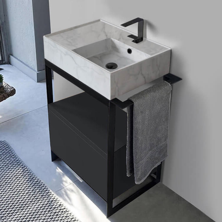This ultra modern console vanity set was designed by Italian manufacturer Scarabeo. Inspired by modern and contemporary style bathroom design, this console set comes with a beautiful ceramic sink that perfectly fits into a matte black sleek console base with a large drawer in a matte black finish. Ceramic sink features right aligned basin which allows for more counter space on the left side of the sink. Sink is available in a one hole or three hole configuration. matte black finished drawer features metal constructed sides and push to open mechanism. Matte black console base is made out of high quality metal and features an integrated side towel bar that can be utilized on the right or left side of the console. This console vanity is part of the Solid collection. Make a bold statement in your bathroom now with this modern console vanity. Ceramic sink (Scarabeo 5117) is US and Canada standards approved (IAPMO, UPC/cUPC, ASME A112.19.2-2018/CSA B45.1-18).
