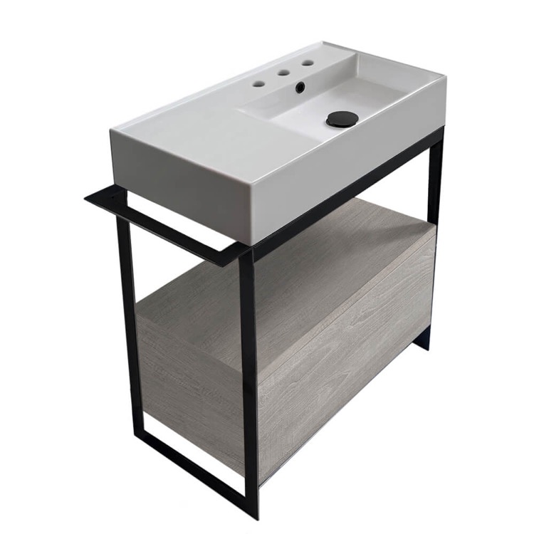 This ultra modern console vanity set was designed by Italian manufacturer Scarabeo. Inspired by modern and contemporary style bathroom design, this console set comes with a beautiful white ceramic sink that perfectly fits into a matte black sleek console base with a large drawer in a grey oak finish. Ceramic sink features right aligned basin which allows for more counter space on the left side of the sink. Sink is available in a one hole, no hole, or three hole configuration. Grey oak finished drawer features metal constructed sides and push to open mechanism. Matte black console base is made out of high quality metal and features an integrated side towel bar that can be utilized on the right or left side of the console. This console vanity is part of the Solid collection. Make a bold statement in your bathroom now with this modern console vanity. Ceramic sink (Scarabeo 5118) is US and Canada standards approved (IAPMO, UPC/cUPC, ASME A112.19.2-2018/CSA B45.1-18).