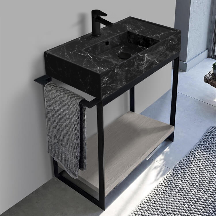 This ultra modern console vanity set was designed by Italian manufacturer Scarabeo. Inspired by modern and contemporary style bathroom design, this console set comes with a beautiful black marble design ceramic sink that perfectly fits into a matte black sleek console base with a lower shelf in a grey oak finish. Ceramic sink features center aligned basin which allows for more counter space on the right and left side of the sink. Sink is available in a one hole or three hole configuration. Console features grey oak finished large bottom shelf for expansive storage underneath the console vanity. Matte black console base is made out of high quality metal and features an integrated side towel bar that can be utilized on the right or left side of the console. This console vanity is part of the Solid collection. Make a bold statement in your bathroom now with this modern console vanity. Ceramic sink (Scarabeo 5123-49) is US and Canada standards approved (IAPMO, UPC/cUPC, ASME A112.19.2-2018/CSA B45.1-18).